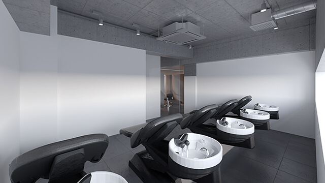 首腰への負担がなく快適な姿勢で施術を堪能できると人気のフラットシャンプー台を設置しています。美容師側も椅子に座って洗うため、腰などへの負担が軽減されます。